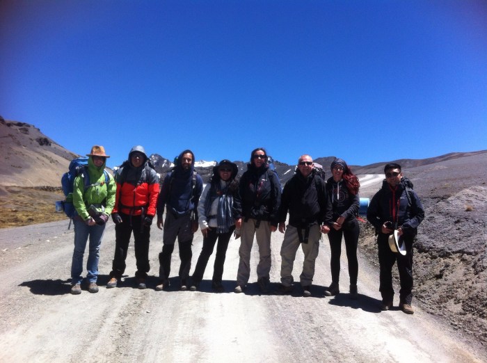Last weekend we went to hike the Choro trail from La Paz to Coroico. This is an Inca built trail starting at El Cumbre (4100m) climbing to 4900m and passing over the mountain summit then descending to Chairo at 1200m. We did this hike 7 years ago with our friend Caz, but this time we went with Mauge our Spanish teacher and a number of other students from the language school. So armed with our tents, water and supplies for three days hiking we set off. It was a real adventure. We only saw two other groups on the trail – apart from the llamas and condors. We remembered it all being downhill, but obviously we had selectively forgotten about the steep inclines and slippery steps aptly named the Steps of Diablo. After walking 21 km on day 1, 17 km on day 2 and 16 km on day 3 we finished feeling shattered with aching knees and a few blisters and bug bites to show for our achievements. The scenery was spectacular.